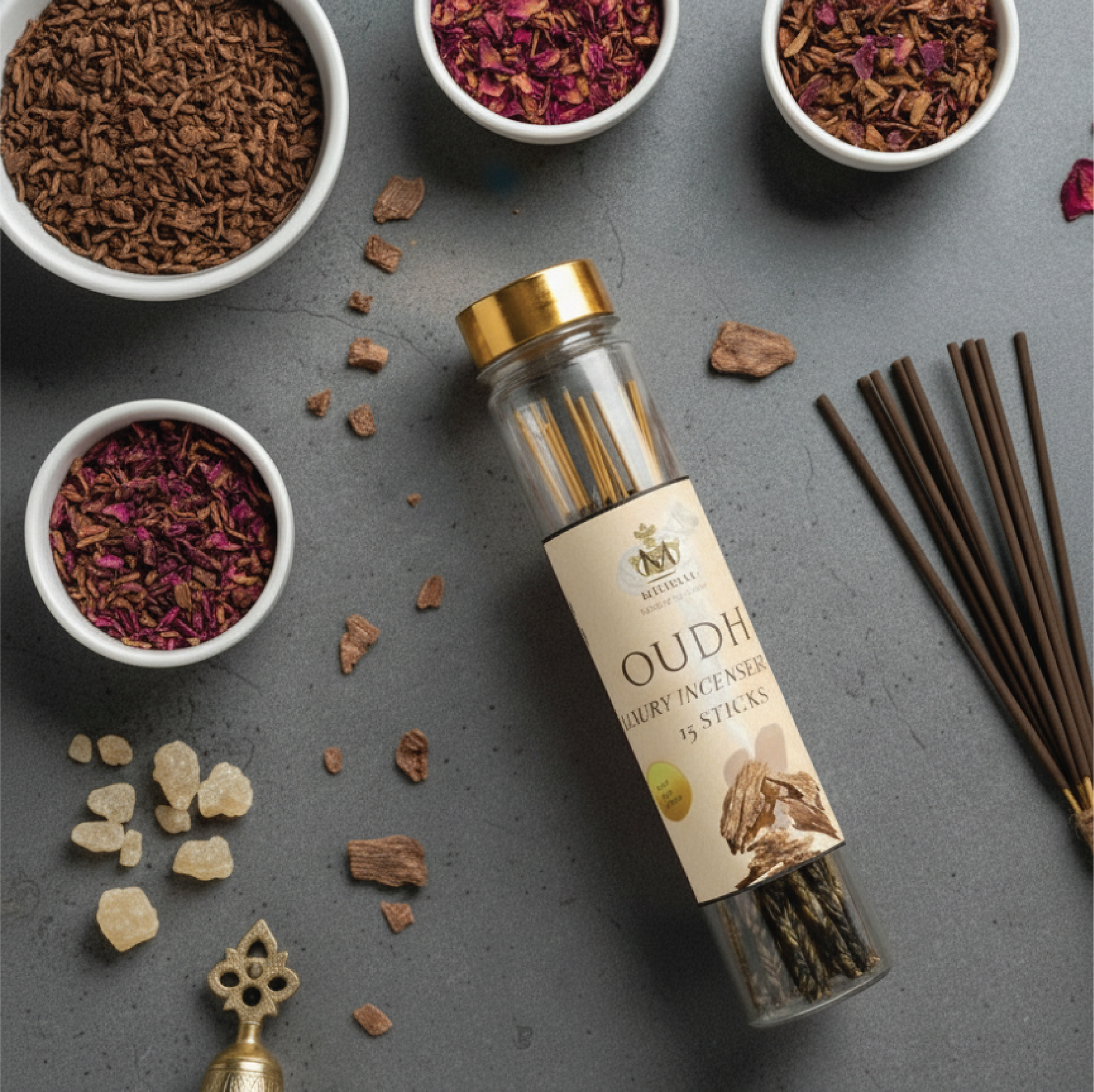 Oudh Incense Sticks exude a dominant oriental-woody fragrance accompanied by soft floral notes of vanilla and musk.