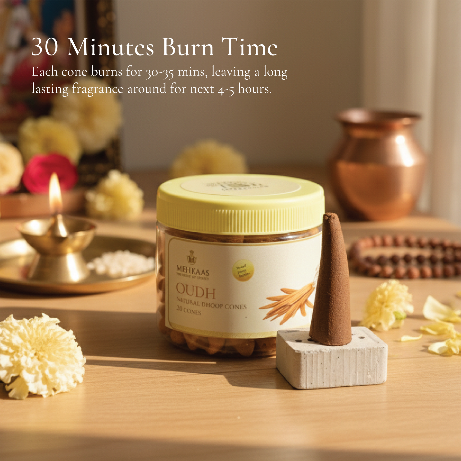 Burns for 30–35 minutes each cone. Ensures consistent fragrance release throughout your session. -